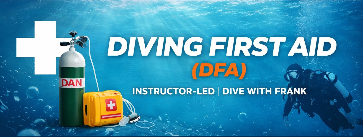 Diving First Aid (DFA) is DAN’s most comprehensive first aid course. CPR, emergency oxygen, neurological assessment, and marine injury response taught hands-on by Dive With Frank.