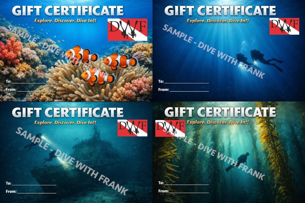 A Dive With Frank gift certificate is a flexible, no-pressure way to give someone time in the water—whether they’re brand new to scuba or already chasing their next dive goal.