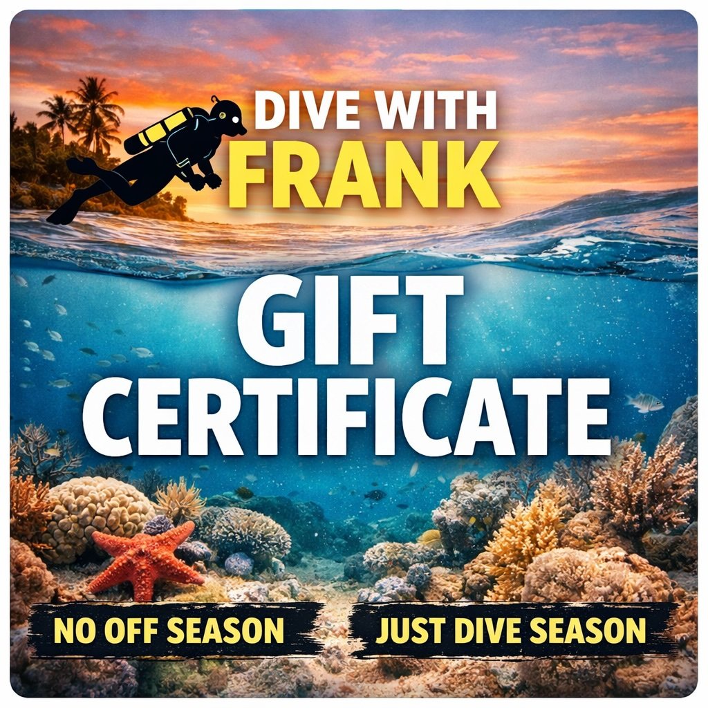 Give the gift of scuba diving, confidence, and real-world skills with a Dive With Frank gift certificate. Digital delivery, no expiration pressure, unforgettable experiences.