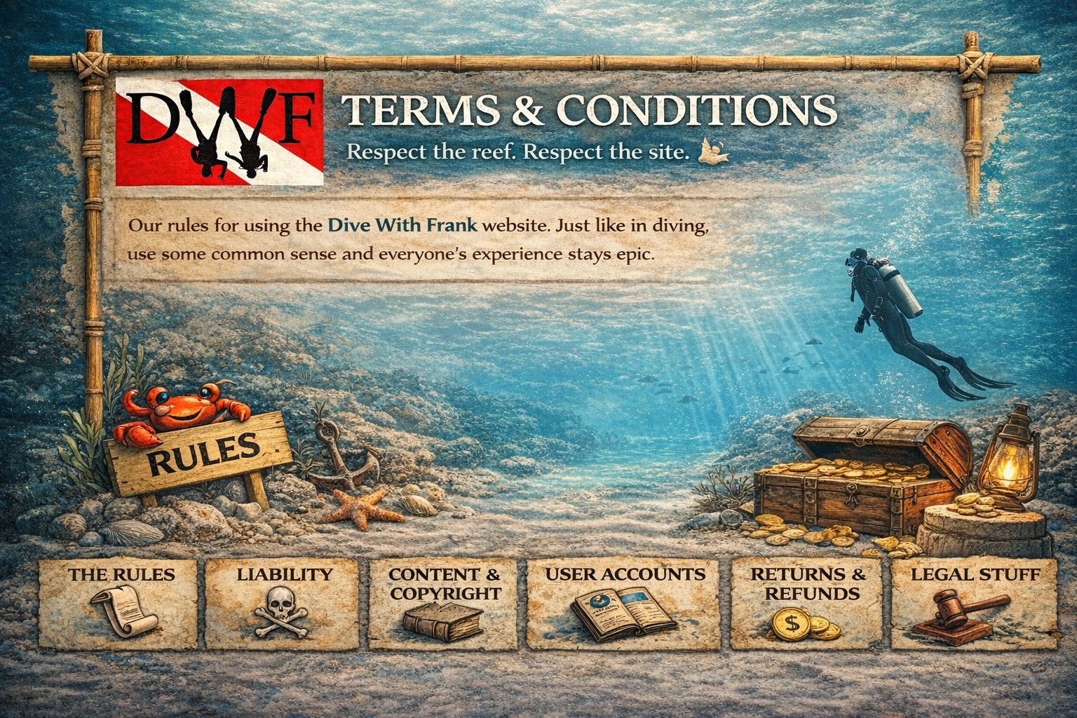 This page lays out the rules for using the Dive With Frank website. Nothing sneaky. Nothing weird. Just a few clear expectations to keep things running smooth.
